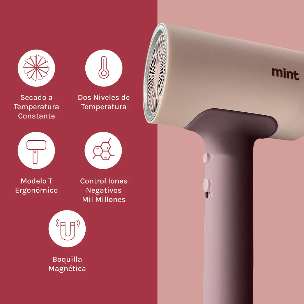 Dale estilo a tu rutina con el Secador Compacto de Mint: potente, liviano y pensado para lograr resultados profesionales desde casa. Su boquilla magnética con giro 360° te permite peinar con total precisión, mientras que los iones negativos ayudan a dejar tu cabello brillante, suave y libre de frizz. Con 1600 W de potencia, función de aire frío y dos niveles de velocidad, seca rápido y sin dañar.